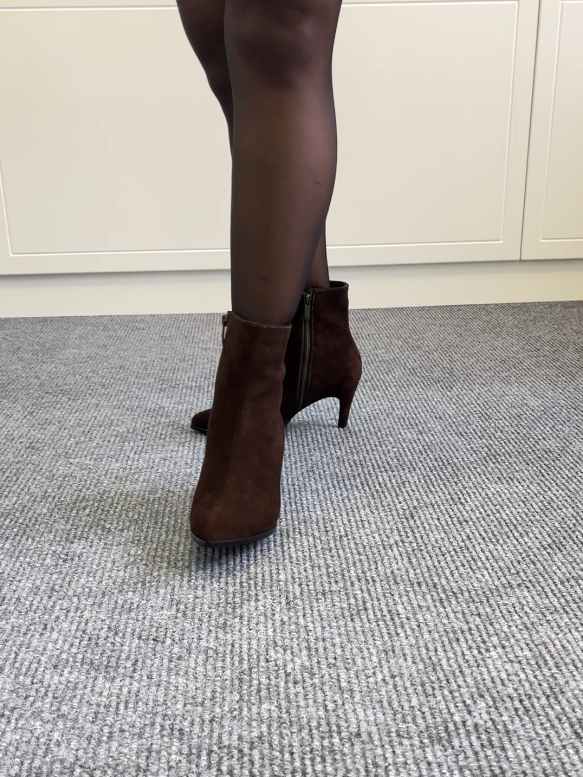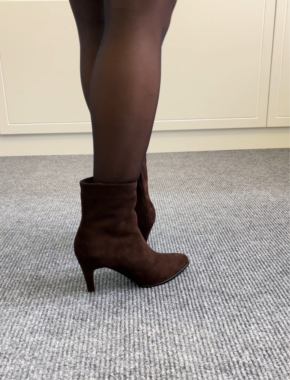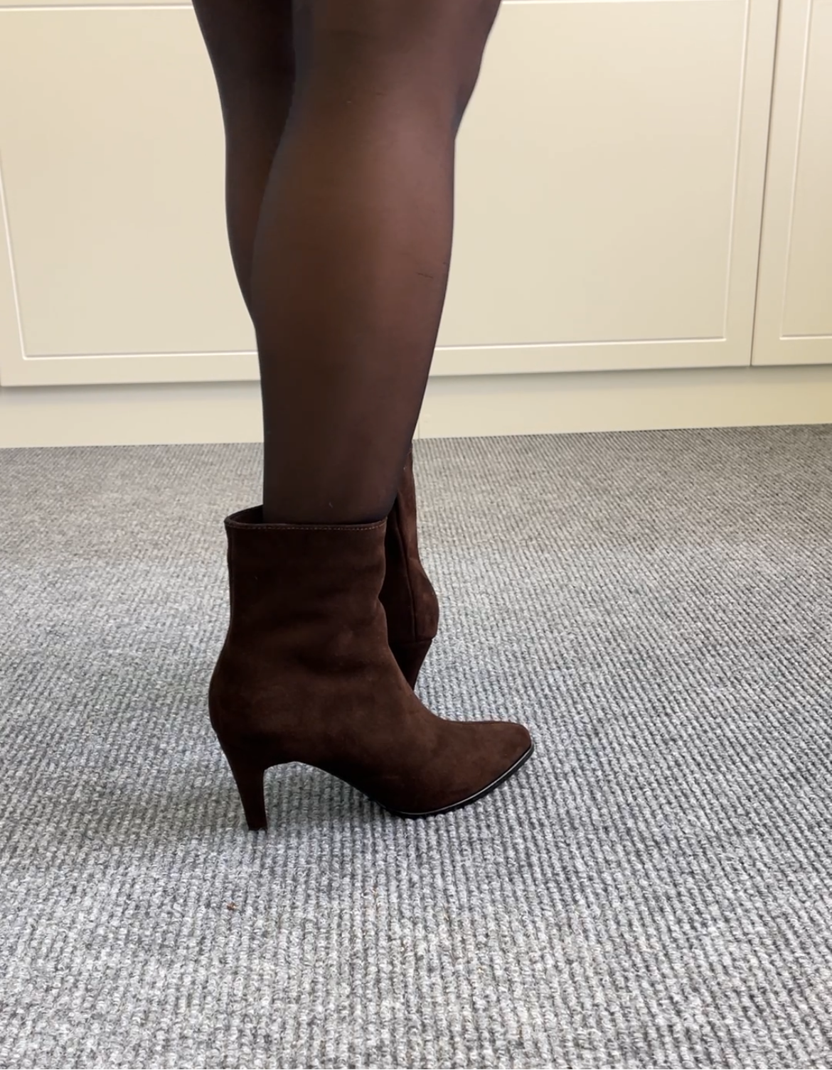 Botines en cuero Gamuzón color Café o Marrón, con cierre lateral y un taco muy estable en una altura 7cm. Interior forrado completamente en suave badana.